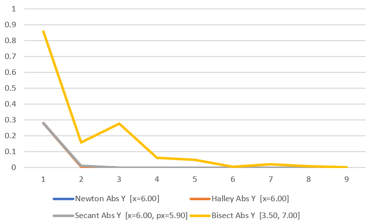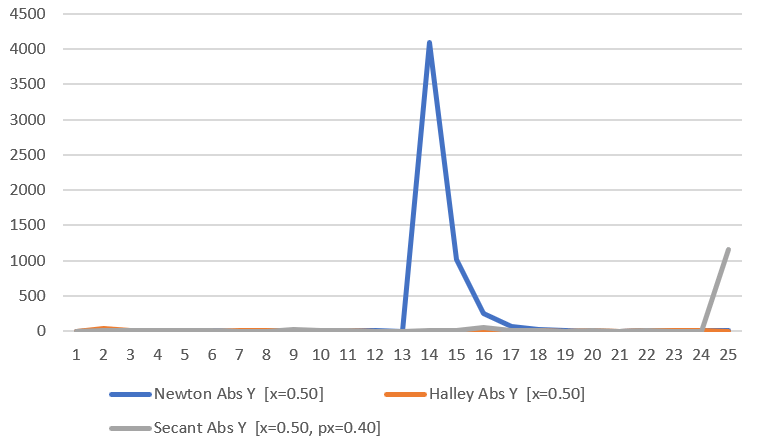 An interesting thing happens here if we choose to start at the value “0.5” for Newton and Halley. The dark blue line for Newton is under the grey line for Halley which is flat and doesn’t go up and down. The reason this happens is that the first derivative is 0 at 0.5 so the algorithm doesn’t know which direction to go and gets stuck.