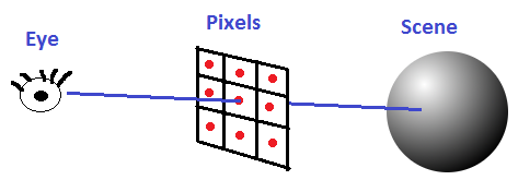 The ray is going to start at the camera location (you could think of this as the eye location), and it’s going to shoot at pixels on an imaginary rectangle in front of the camera, go through those pixels, and go out into the scene to see what they hit.