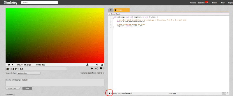 In these articles we are going to be doing path tracing in shadertoy because it’s very easy to do so. You should head over there, create an account and look around a bit at some of the shadertoys. Shadertoy works best in chrome or firefox.