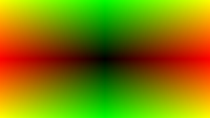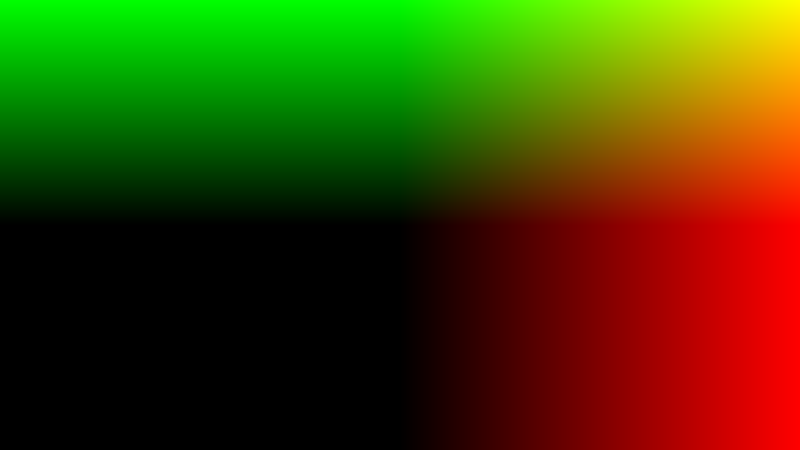 We can see now that it’s black in the middle of the screen, and going to the right makes the pixels more red while going up makes the pixels more green. However, going left and down doesn’t change the color at all and just leaves it black. This is because colors are clamped to be between 0 and 1 before being displayed, making all negative numbers just be zero.