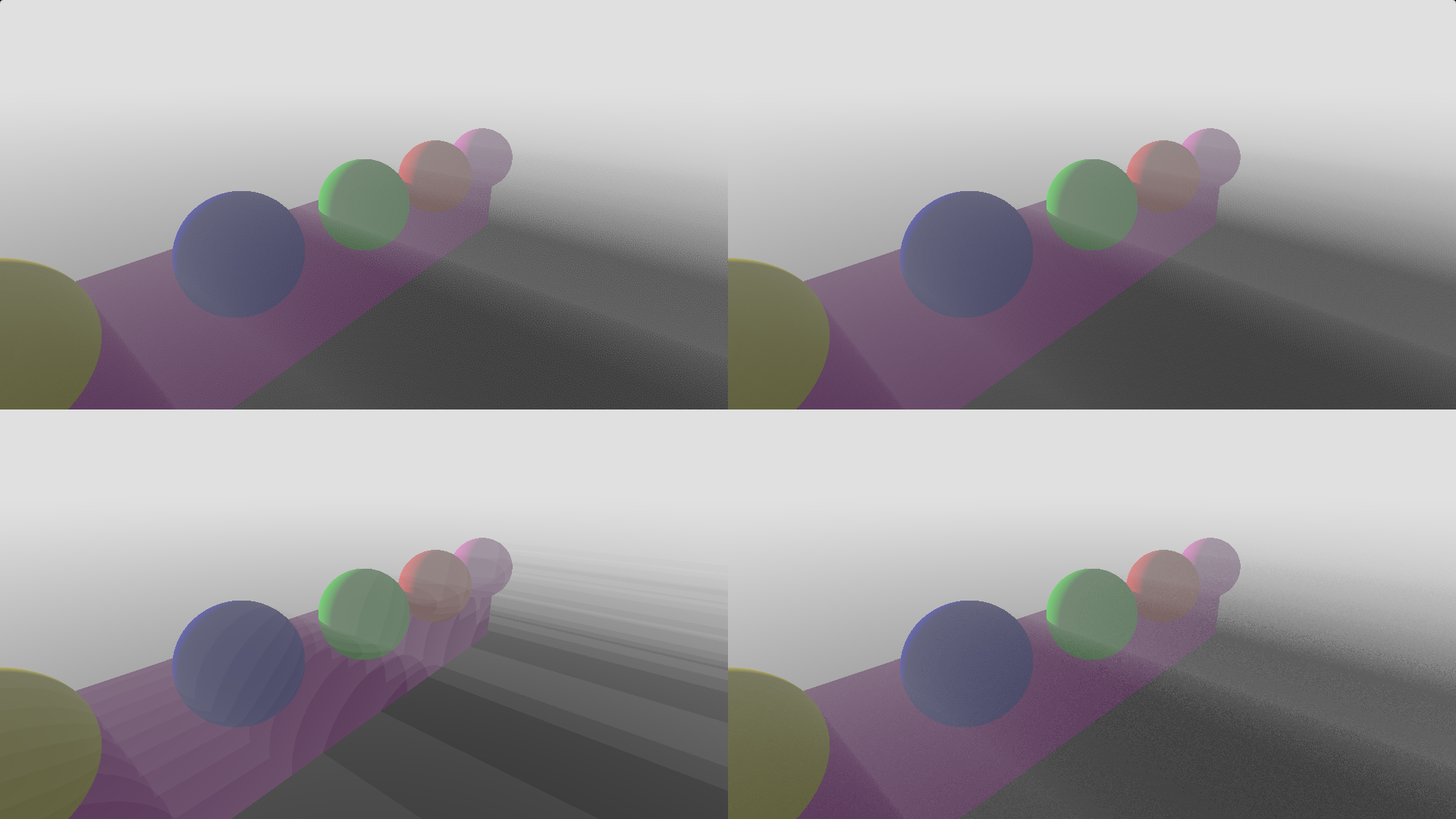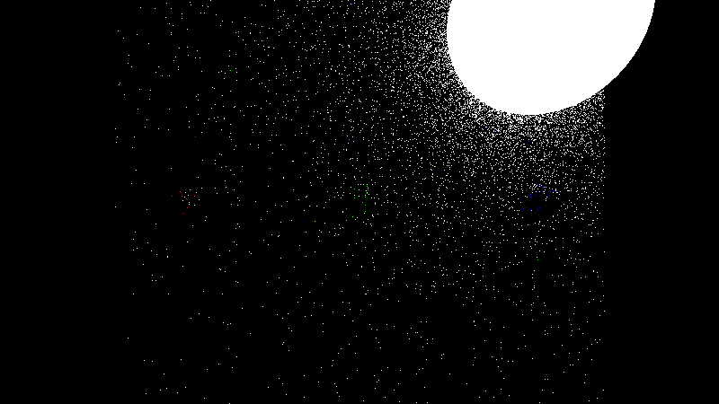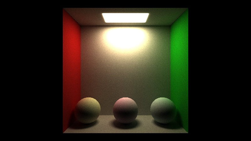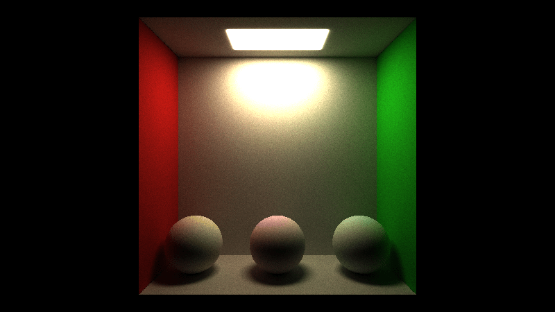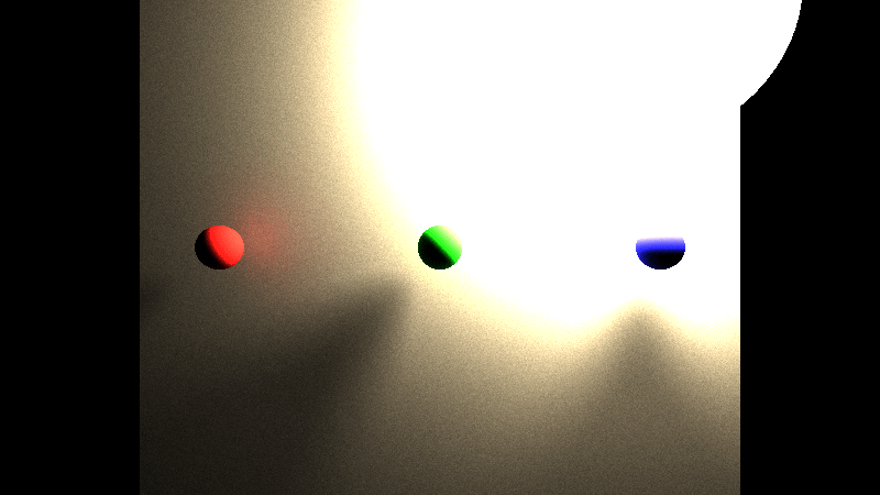 After 5 minutes of rendering, the result looks pretty noisy, pixels are too bright and clip, and it isn’t a great scene, but we are in fact path tracing now! You can even see some neat lighting effects, like how you see some red on the wall next to the red ball, due to light reflecting off of it. The spheres are casting some nice looking shadows too.