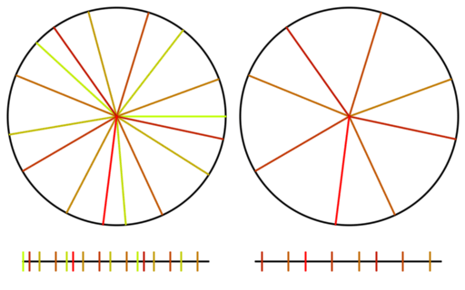 Lastly, here is the same with pi. Pi is well approximated by 22/7 and since we are walking around a circle, the integer parts are irrelevant. Since 22/7 is 3 1/7, that makes pi act nearly like 1/7 and you can verify that it is indeed nearly repeating every 7 samples, and acting very much like 1/7. You can see how pi has samples that clump and it doesn’t give very good coverage over the sample domain for the number of samples it uses (compare the coverage to golden ratio!). This shows how a less irrational number isn’t as good at being a low discrepancy sequence.