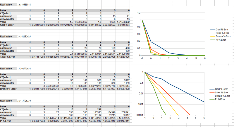 Below shows the percentage error of each number, as more terms in the continued fraction are added.