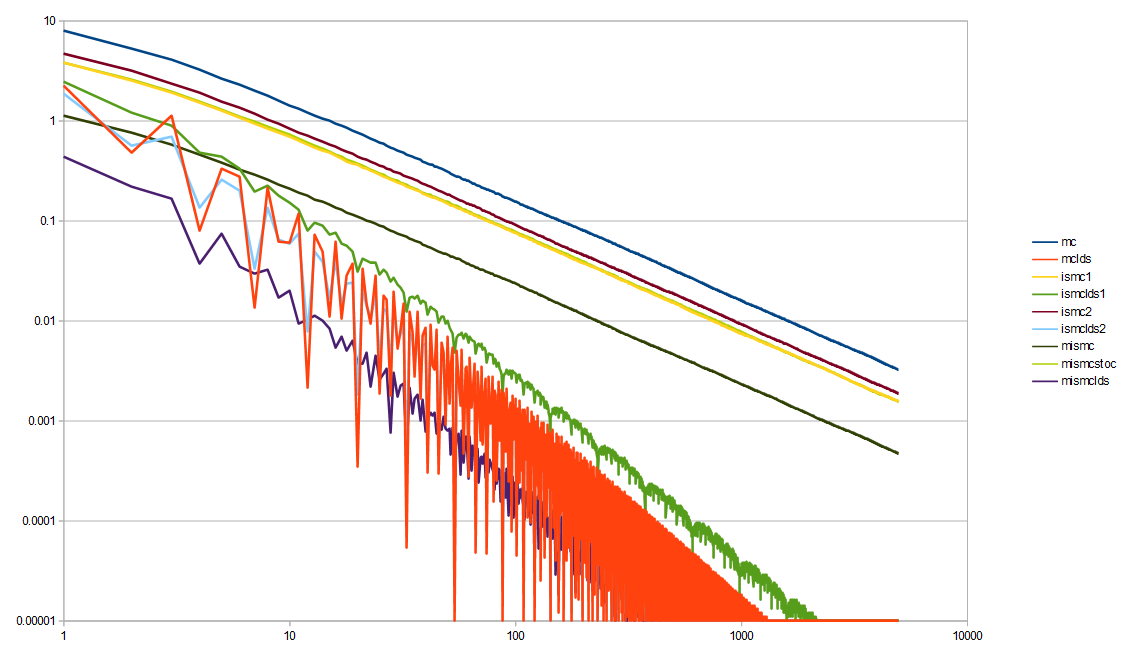 Not using LDS, Monte Carlo was the worst performing, but using LDS, Monte Carlo is in the middle, and it’s the first importance sampling technique that does the worst. The second importance sampling technique is in the middle whether you use LDS or not though.