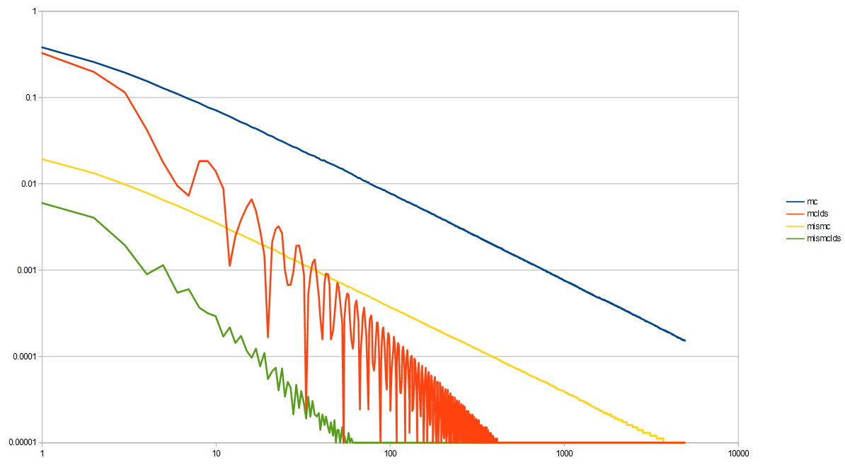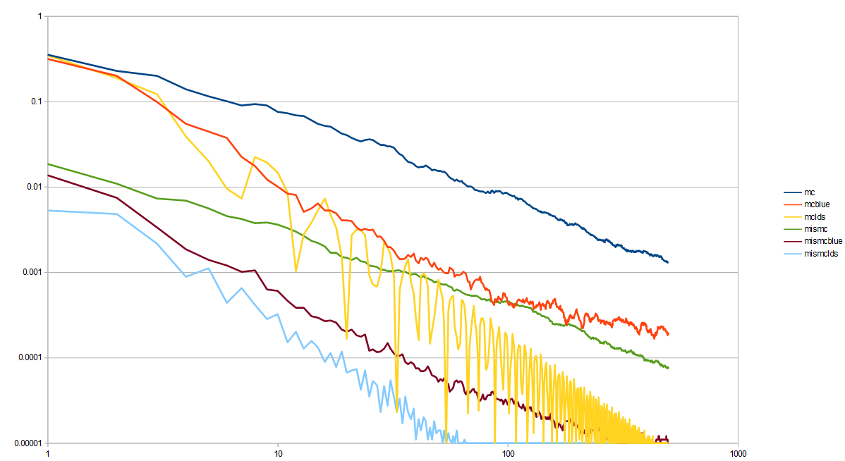 Here is the second experiment, which compared MC to IS to MIS, now including low discrepancy sequences: