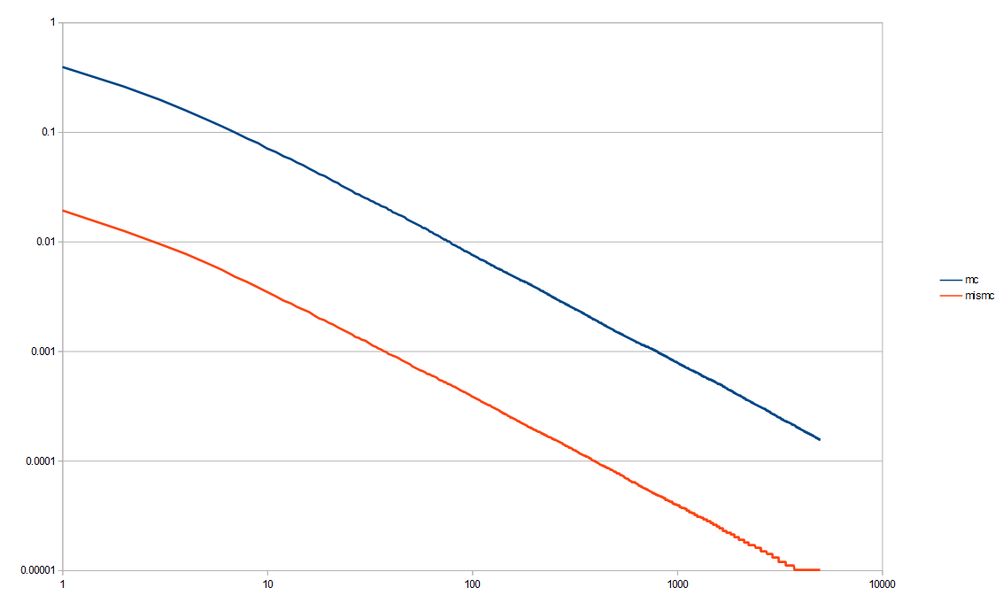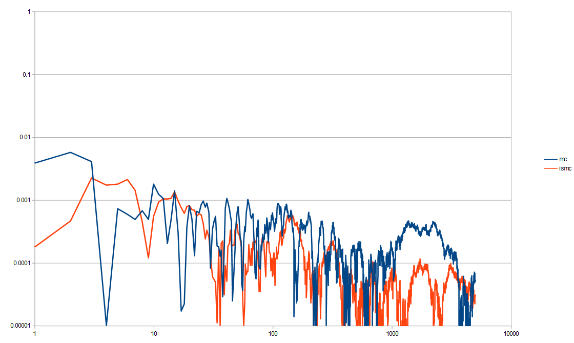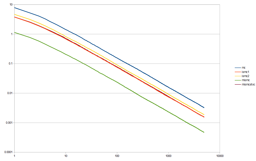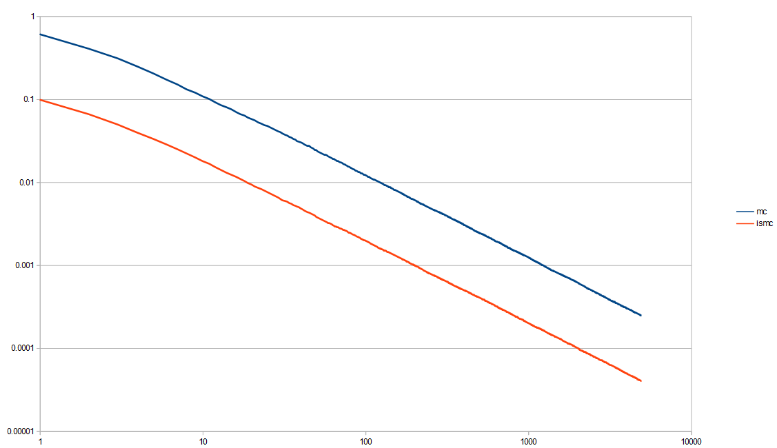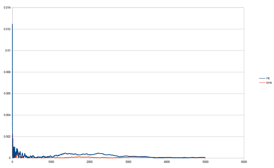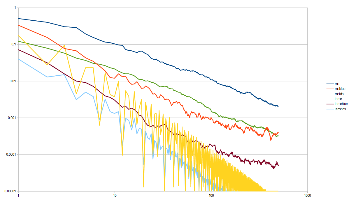 Here is the first experiment, which compared Monte Carlo (mc, blue) to importance sampling (ismc, yellow), now also using low discrepancy sequences for both.