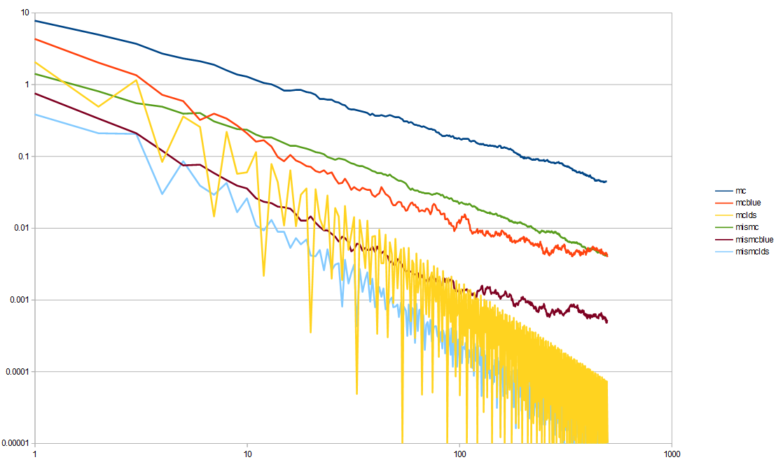 Before moving on, look at that last graph again. The amount of variance that 5,000 white noise samples has is the same variance that piecewise importance sampling had, when using only 10 low discrepancy samples. Without LDS though, even the MIS strategy took something like 800 samples to reach that level of variance.