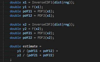 F is the function being integrated. PDF1 / InverseCDF1 are for the first importance sampling technique. PDF2 / InverseCDF2 are for the second importance sampling technique. You do this in a loop N times, and take the average of those N estimates, to get your final estimate.