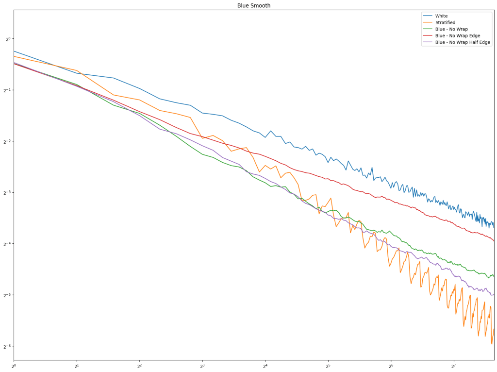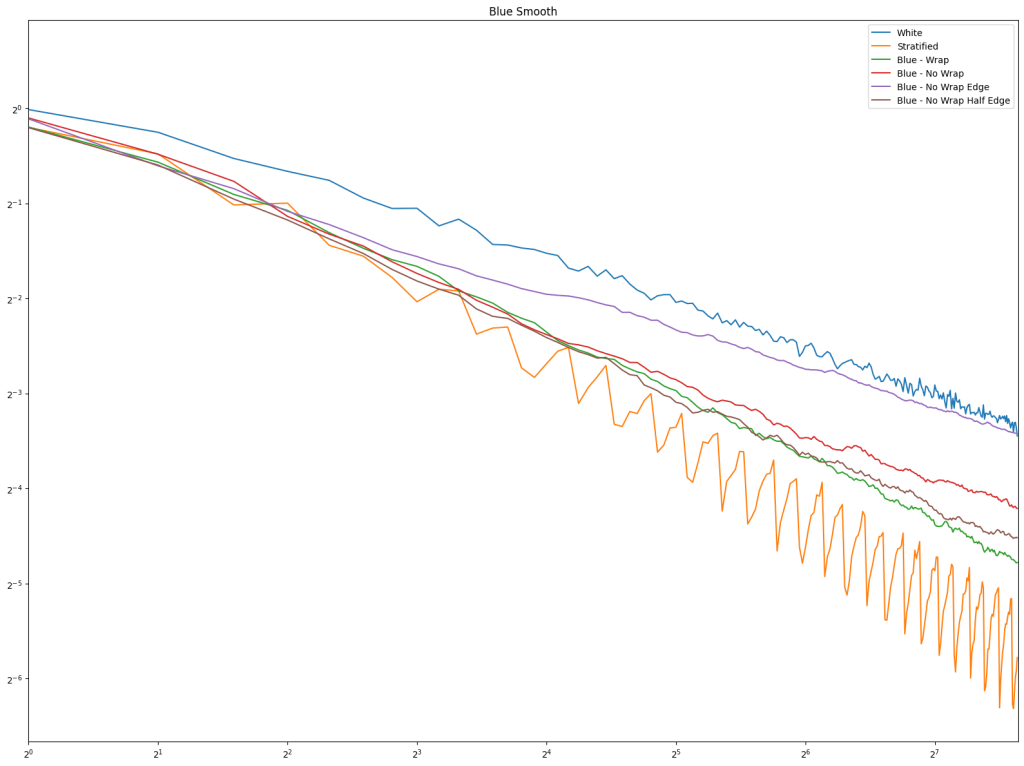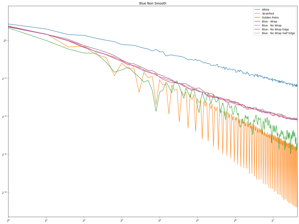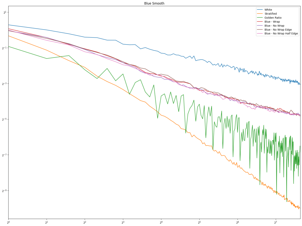 Lastly is blue noise which seems to indicate that wrapping would be good, by “half edge” distance doing the best for the most part. This is also showing that sampling away from the edges is a good thing.