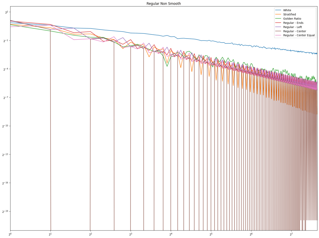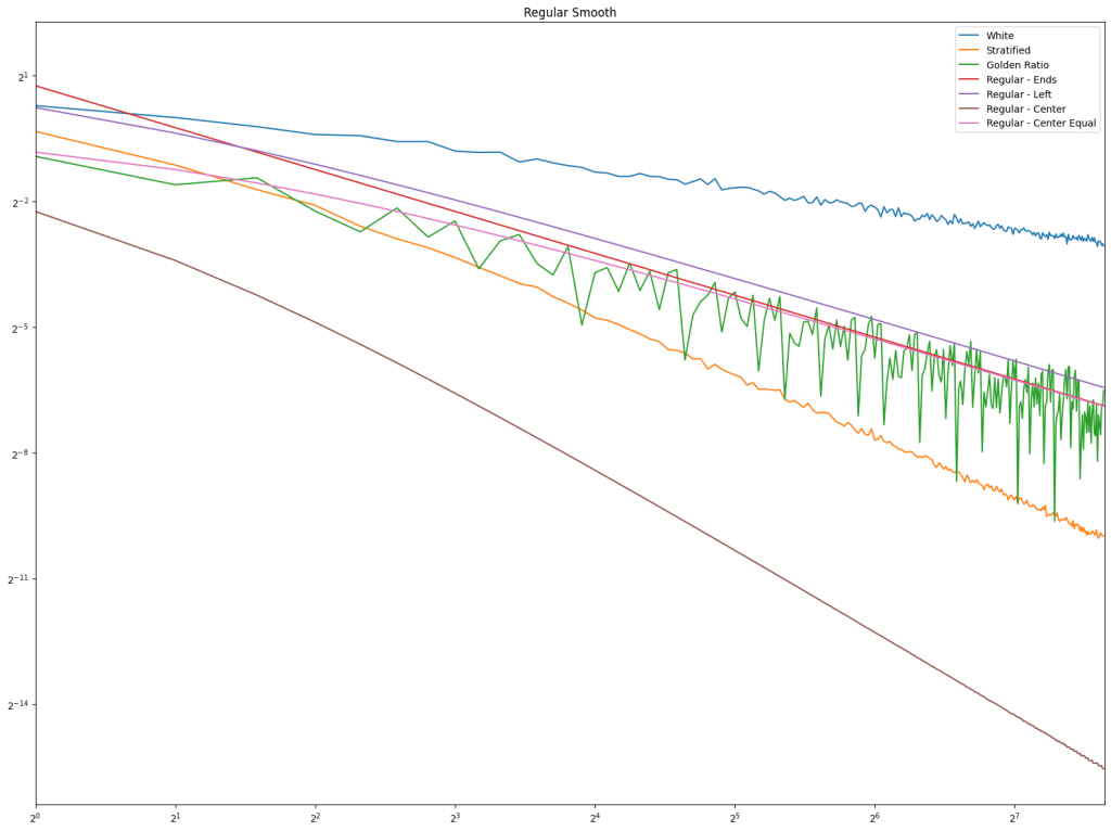This group of tests will primarily look at two types of 1D sampling: regular sampling and blue noise sampling. The golden ratio low discrepancy sequence, stratified sampling and white noise are also included.