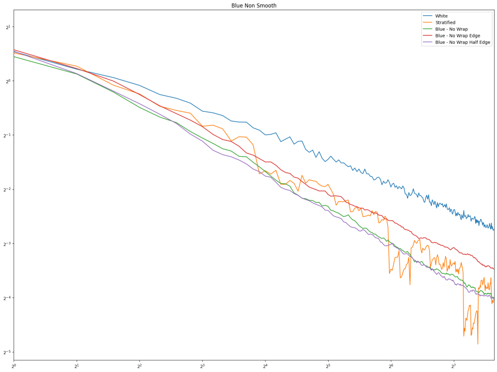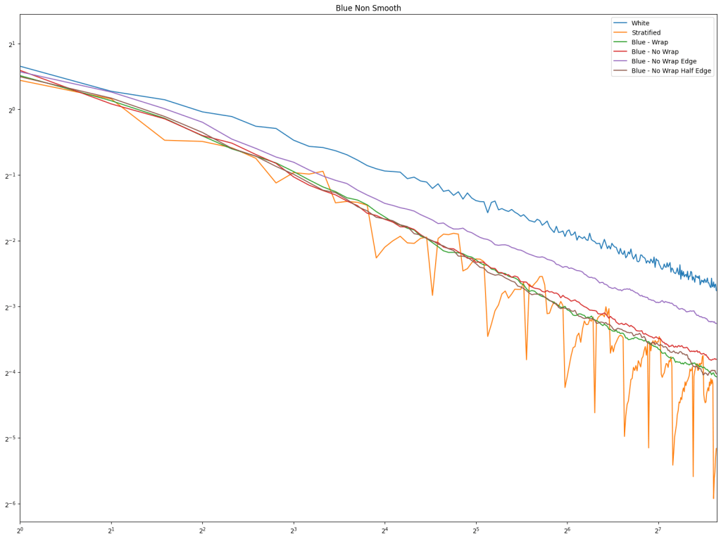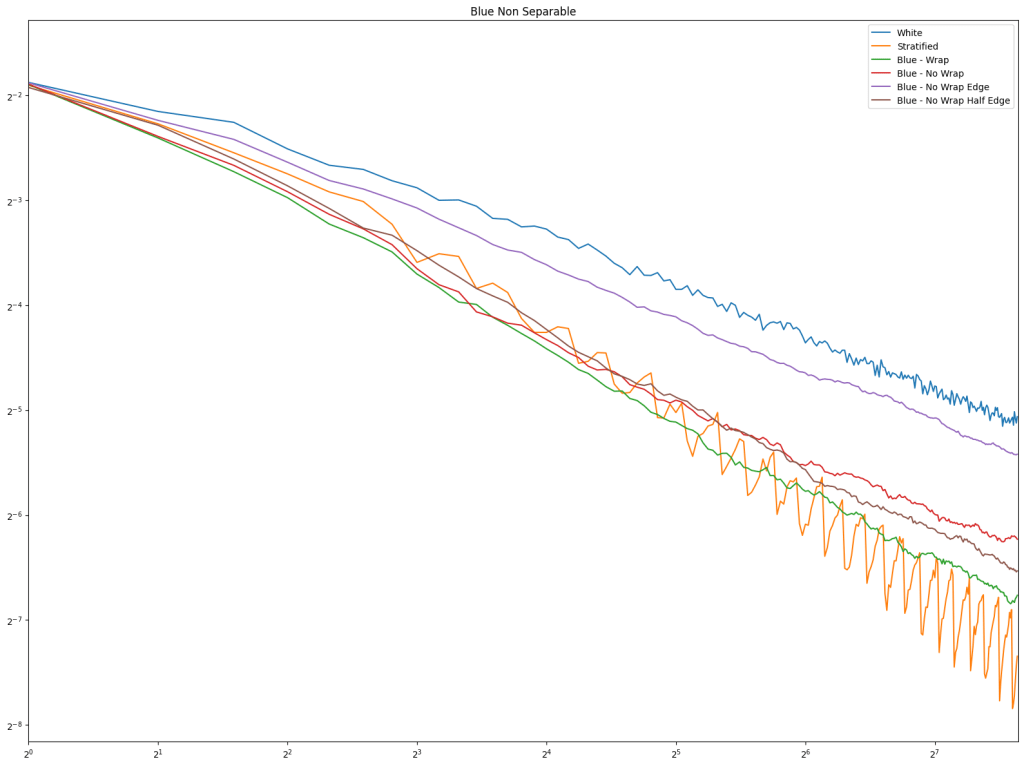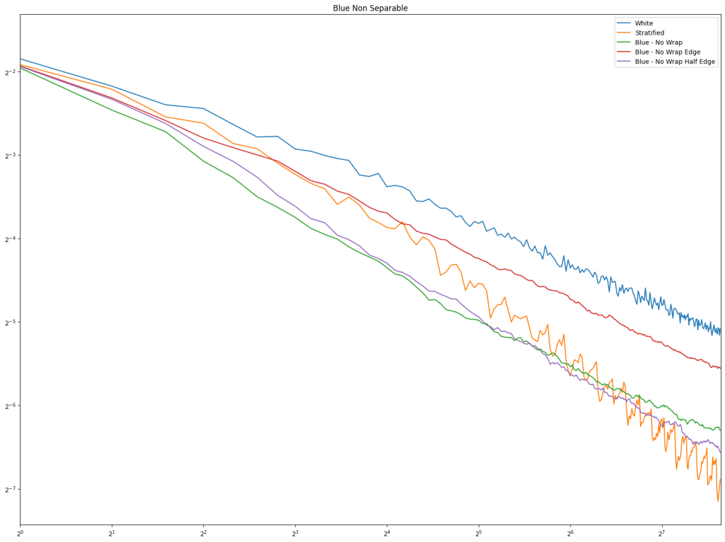 Lastly is the blue noise. Unlike in 1D, it does seem that blue noise cares about wrapping here in 2D, and that wrapping is best, with the half edge no wrapping being in second place. The half edge doing well also indicates that sampling away from the edges is a good idea. Blue noise sample points still don’t converge very well though.