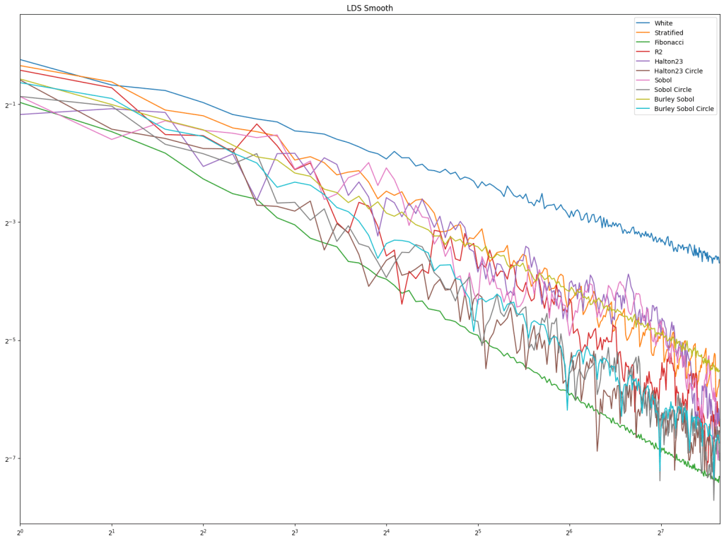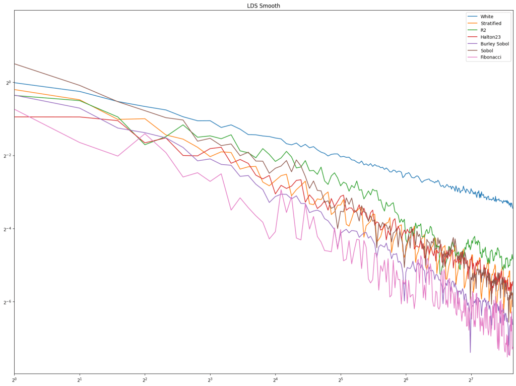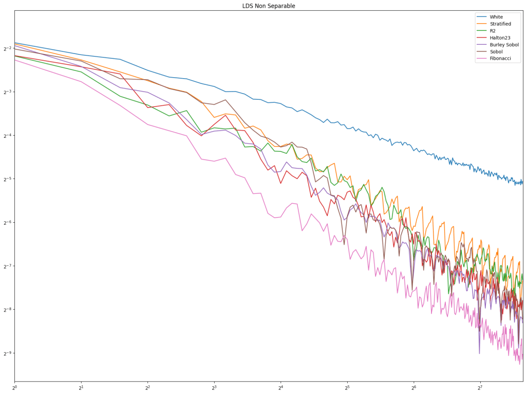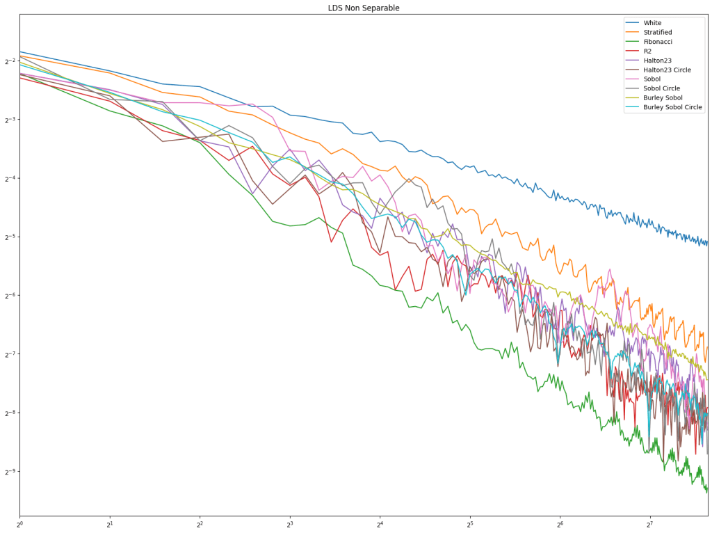 Next up is low discrepancy sequences. Fibonacci does well pretty consistently, but Burley Sobol also does. R2 doesn’t do very well in these tests, but these types of tests usually have much higher sample counts, and R2 is much more competitive there in my experience.