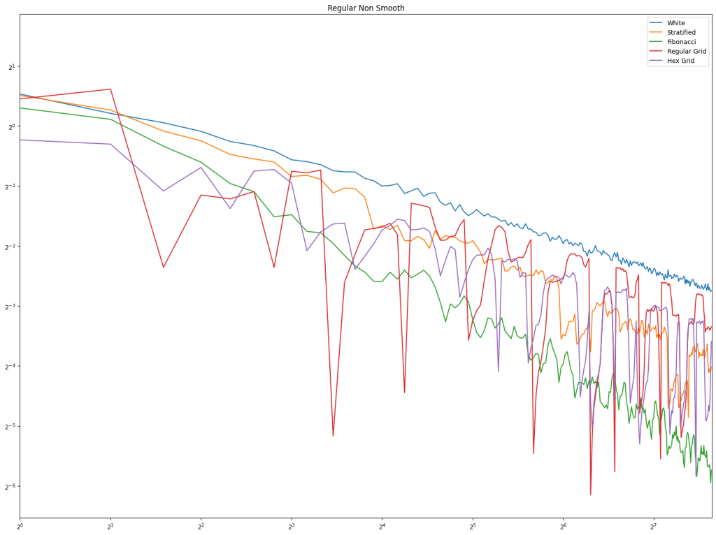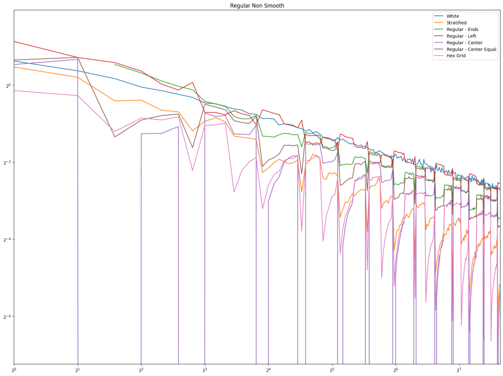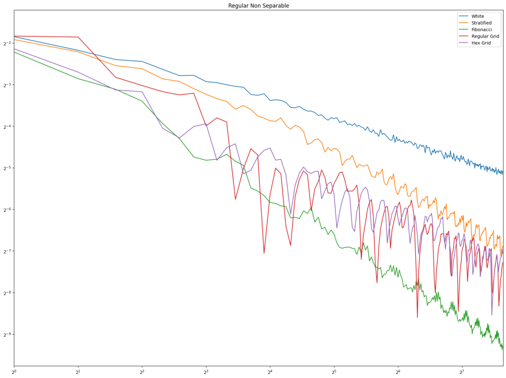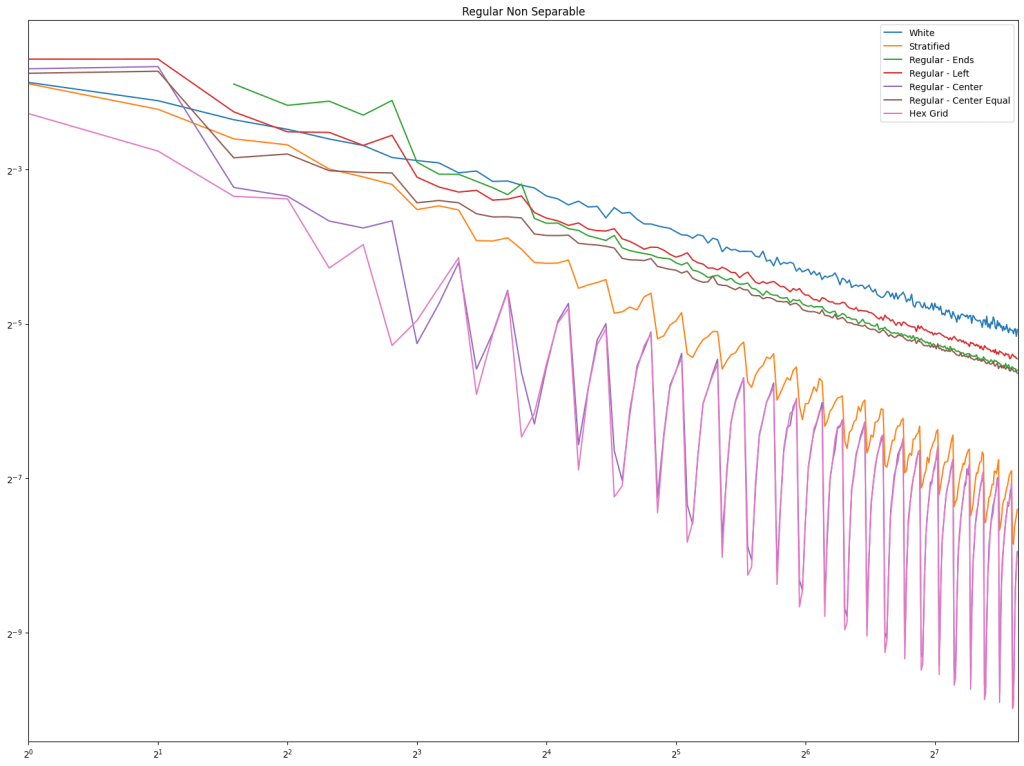 First is regular sampling. White noise does terribly as always. Regular center is the winner, along with hex grid coming in second, and stratified in third. This shows that in 2D, like in 1D, avoiding the edges of the sampling domain by half a sample distance is a good idea.