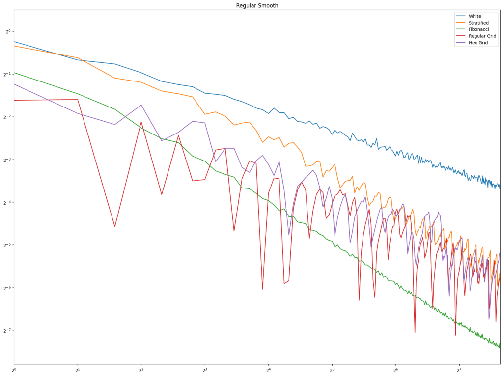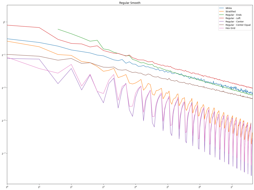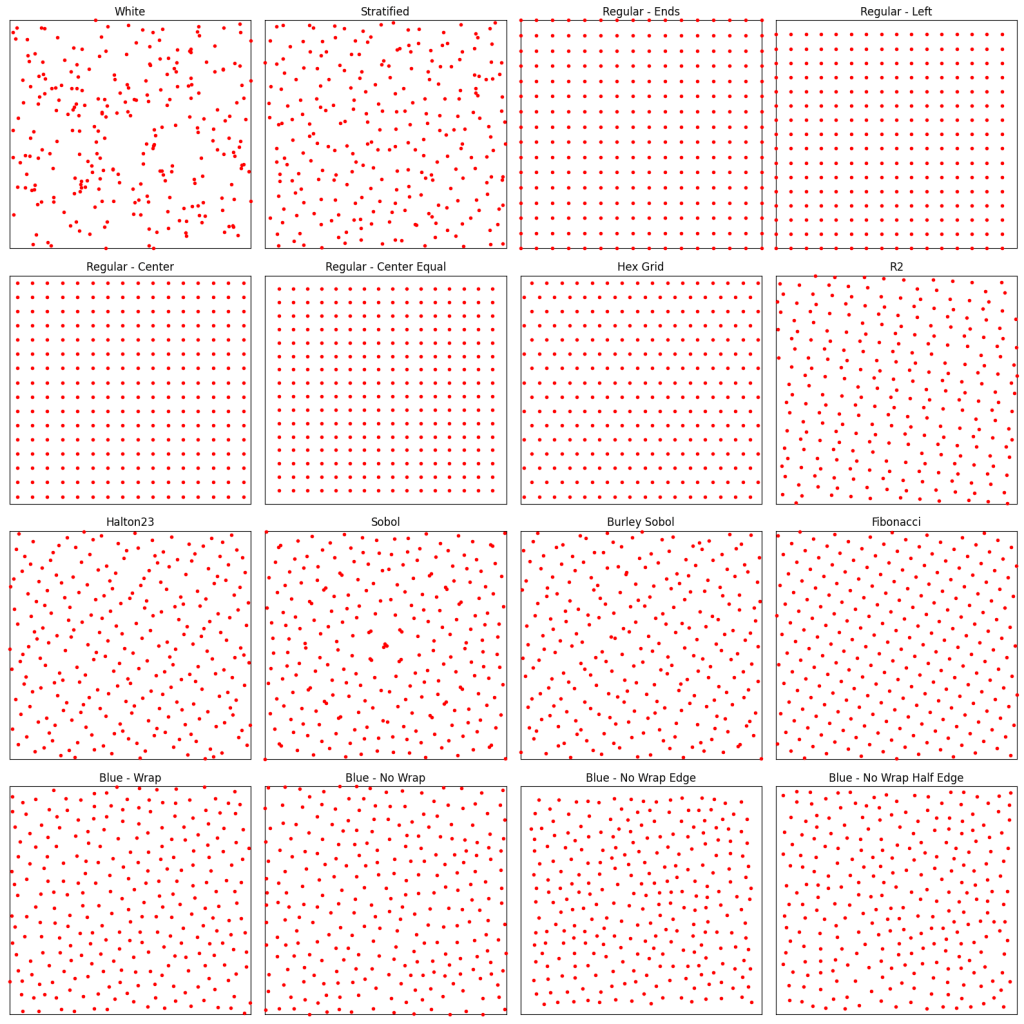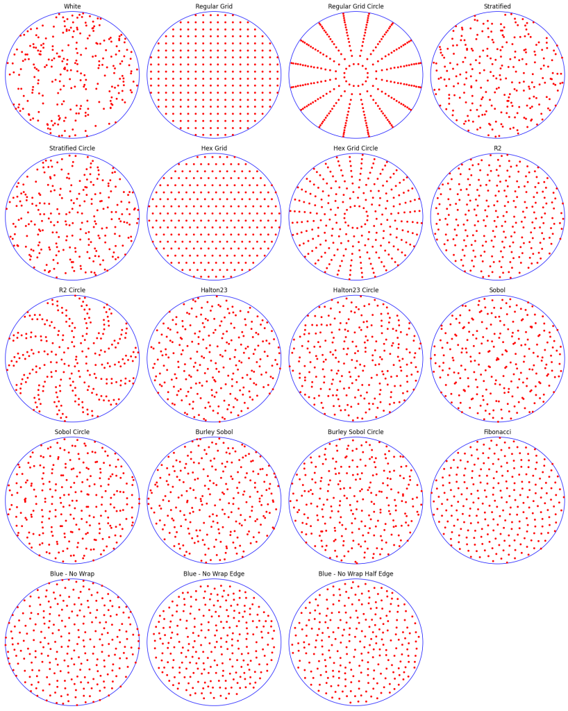 That came up in a recent conversation (https://mastodon.gamedev.place/@jkaniarz/110032776950329500), so this post looks at the evidence of whether or not that is true – looking at regular sampling, blue noise sampling, and low discrepancy sequences (LDS). LDS are a bit of a tangent, but it’s good to see how they converge in relation to the other sampling types.