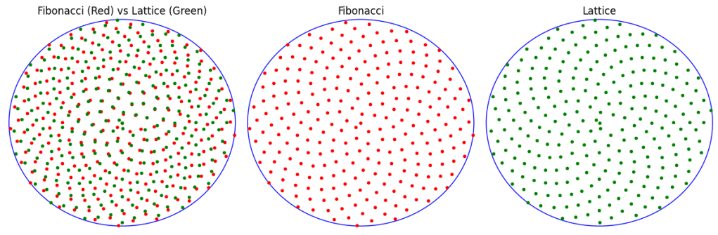 When we map it to a circle, the difference is more pronounced. The Fibonacci circle has that familiar look that you see in sunflowers. The Lattice however just looks like spirals. When they are overlaid, you can see they diverge quite a bit.