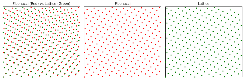 To do this, I grabbed 3 points of Fibonacci in a triangle, to get two vectors to use for lattice axes. I then used that to make a lattice that you can see below. Side by side Fibonacci and the lattice are hard to tell apart, but when they are put on top of each other, you can see how Fibonacci is not a lattice, but deviates from the lattice over space.