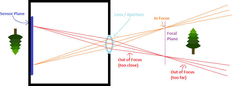 This means that if we had a camera with a sensor plane looking through a lens, that there would be a focal PLANE on the other side of the lens, made up of the focus points of each point for each sensor on the sensor plane. Things closer than the focus plane would be blurry, and things farther than the focus plane would be blurry, but things near the focus plane would be sharper.